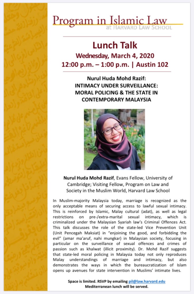 Upcoming lunch talk on Wednesday, 4 March 2020 at the Program in Islamic Law, Harvard Law School. All welcome!