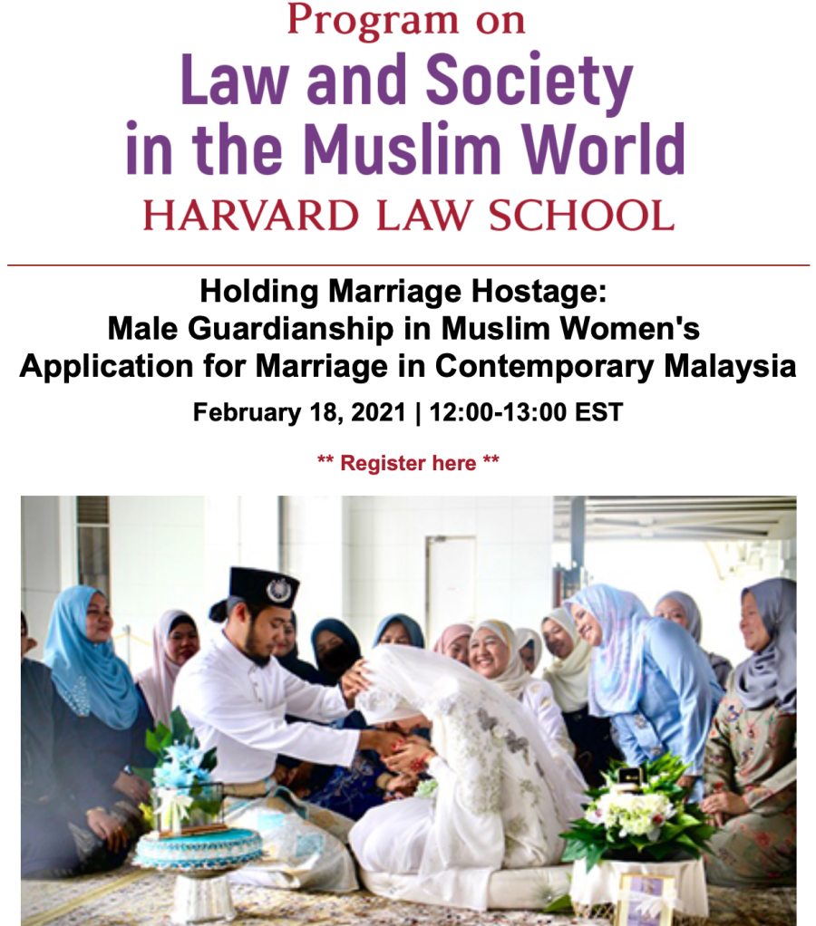On Thursday, 18 February 2021, I will be presenting a Zoom webinar at Harvard Law School’s Program on Law & Society in the Muslim World, entitled “Holding Marriage Hostage: Male Guardianship in Muslim Women’s Marriage Application in Contemporary Malaysia”. The talk will be chaired by Professor Dominik Müller (Friedrich-Alexander-Universität Erlangen-Nürnberg, Germany).