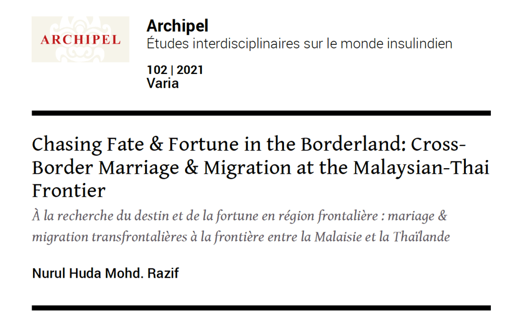 My most recent peer-reviewed article, “Chasing Fate & Fortune in the Borderland: Cross-Border Marriage and Migration at the Malaysian-Thai Frontier”, has just been published in the Southeast Asian studies journal Archipel. In this article, I demonstrate how female migrants from Southern Thailand migrate to Malaysia in search of fortune in two senses of the word: rezeki (economic sustenance) and jodoh (fated match; one’s destined spouse). This study contributes to a wider discussion on the feminization of migration, while also subverting the traditional narrative of migrant women as victims of precarity.